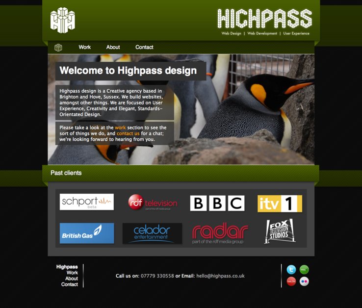 Highpass design are a small design agency currently based in Brighton and Hove, Sussex. We have worked on projects from graphic design for major TV companies to website creation for small local businesses and we love the world of design. We've been at this lark for over 10 years and watched the trends of design come and go.