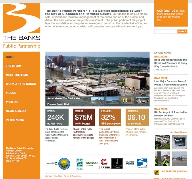 Centogram designs smart, effective solutions to meet our clients' needs, and we rally whatever resources we need to accomplish that. In the case of the Banks project, Centogram partnered with professionals in design and in marketing to build a site that shares up-to-the-minute information about a high-profile Cincinnati project. This Drupal-based site is built to automate content with current status metrics, press releases, photos, videos and more, all of which keeps the site dynamic and the citizens of Cincinnati involved in this city-changing venture.