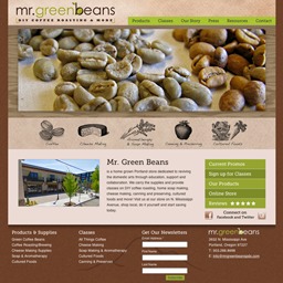 A screenshot from the homepage of MrGreenBeans.com. They sell green coffee beans and teach an assortment of DIY classes (roasting, soap-making, canning & preserving, etc.)