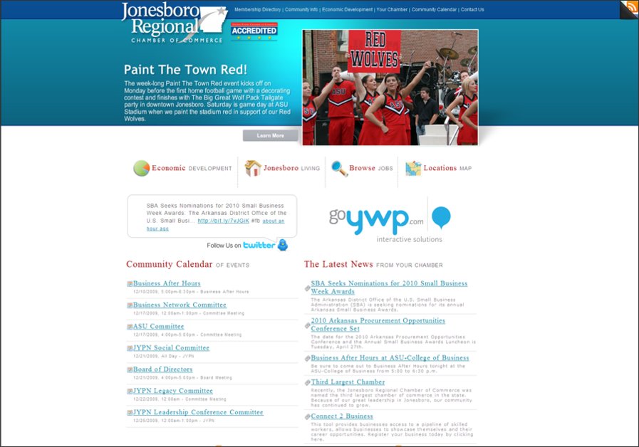 This is a screenshot from one of our latest projects, Jonesboro Regional Chamber of Commerce. This site features a dynamic XML-driven flash header, social networking tools, a twitter widget and news/calendar widgets which update automatically as content is created.