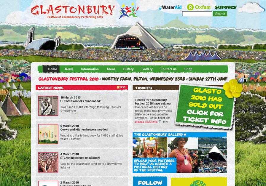 The aim of the site design was to not only to convey the spirit of Glastonbury Festival to the user, but also to create a highly usable interface and hierachy that would allow the visitor to efficiently navigate the vast amount of information. available.