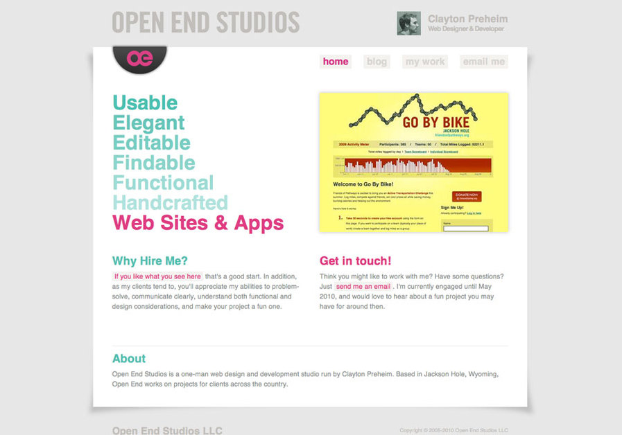 Open End Studios is a one-man web design and development studio run by Clayton Preheim, focused squarely on usability, web standards, elegant design, and the Getting Real approach to web development. Based in Jackson Hole, Wyoming, Open End works on projects for clients across the country.