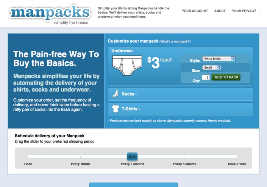 A screenshot of manpacks.com, the place to have your underwear sent to you on a schedule