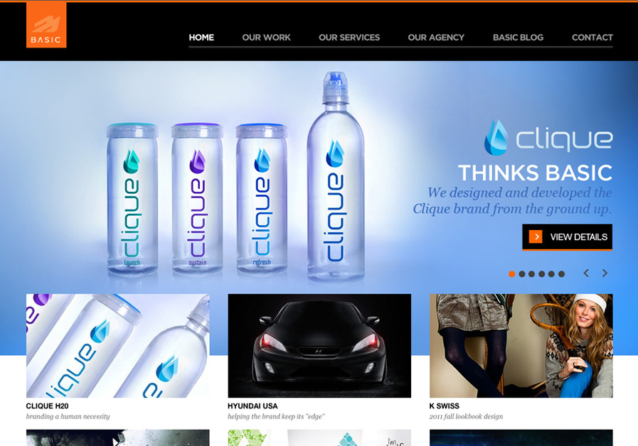 This is a screen shot of our new company home page featuring our work for Clique, Hyundai, and K-Swiss.