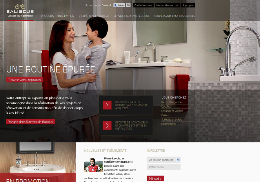 Une de nos plus récentes mises en ligne, Baliscus est une entreprise experte en plomberie et en projets de rénovation et de construction. Le site web cherche à présenter le lustre et la qualité des produits offerts par Baliscus, notamment à travers une section inspiration, qui présente sous forme de galerie photo plusieurs réalisations en plomberie. Le site a été optimisé pour les différentes plateformes mobiles (iPhone, iPad, Android, etc.).