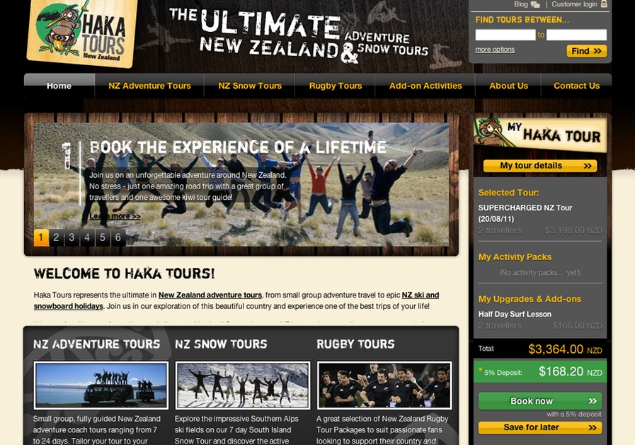 This is a screenshot of our latest tourism redesign of hakatours.com. It's been a great success, more trafic and more sales and very happy client!