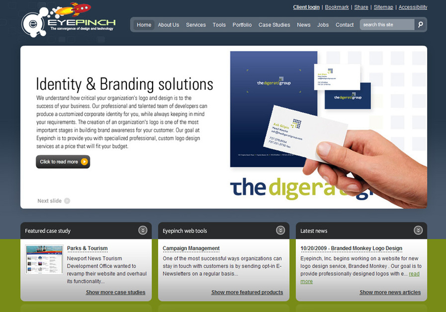Eyepinch, Inc., a Virginia-based web solutions firm, offers custom business solutions by means of online web applications. We provide a large variety of services including but not limited to graphic design and brand identity, specialized programming, web development, search engine optimization, web hosting and more.