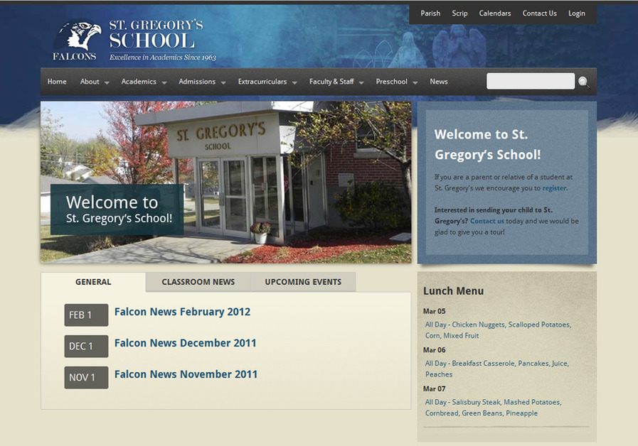 This is a screenshot of the brand new St. Gregory's School website. St. Gregory’s School in Maryville, MO is the top private Catholic school in Northwest Missouri. With an emphasis on higher academic standards their students are well positioned to take on the challenges of higher education with a solid background in Christian faith. As an alumni of St. Gregory’s School it was an honor to help build them a website that will serve to help them do their excellent work for years to come.