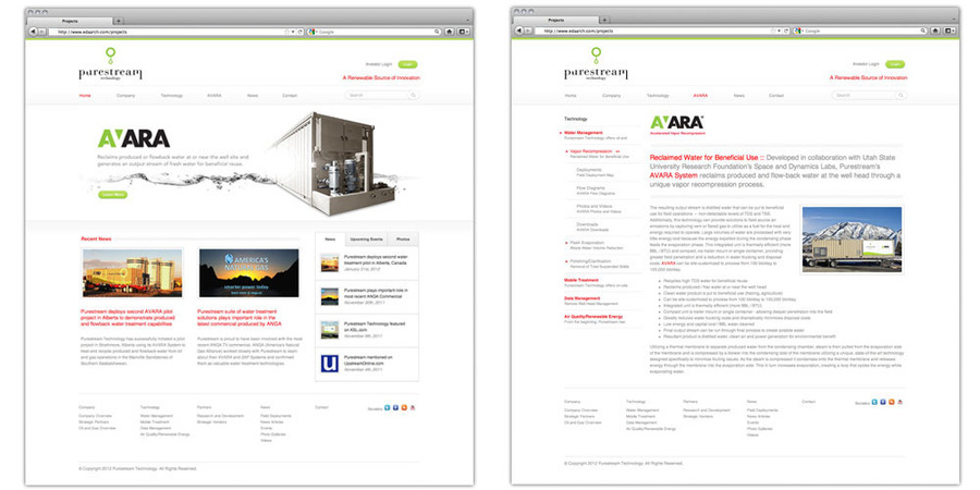 This is a screen shot of the corporate website we designed for Purestream Technology.