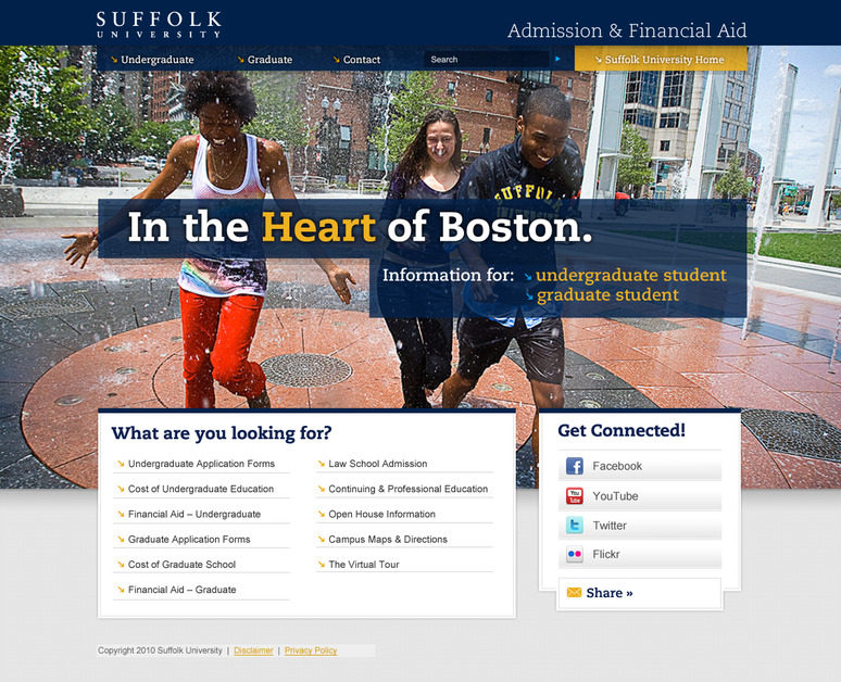 Suffolk University came to us to improve their "out of date and stuffy" web presence into something more fun and engaging. The result speaks for itself.