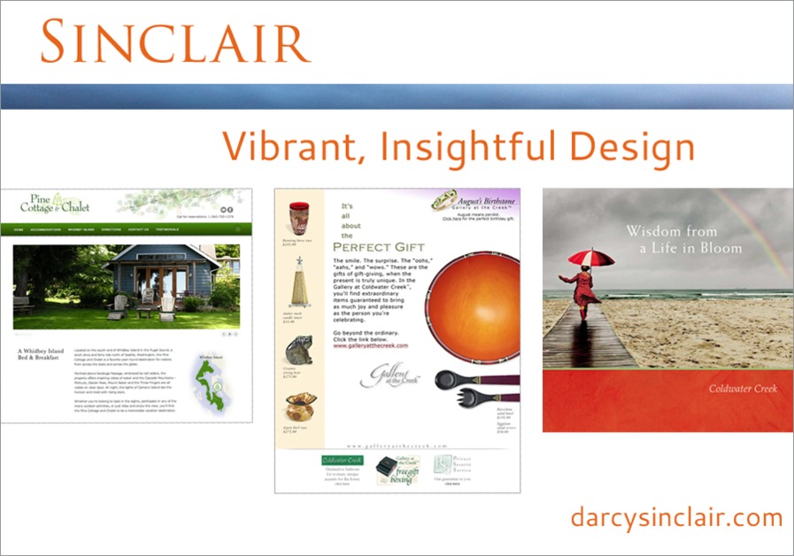 Darcy Sinclair specializes in design solutions for marketing and communication. I've been in the business for over twenty years providing clients in diverse industries with creative innovation and strong project management in both print and web. My current favorite web platform is WordPress which allows my clients the ability to make their own updates once their site is designed.