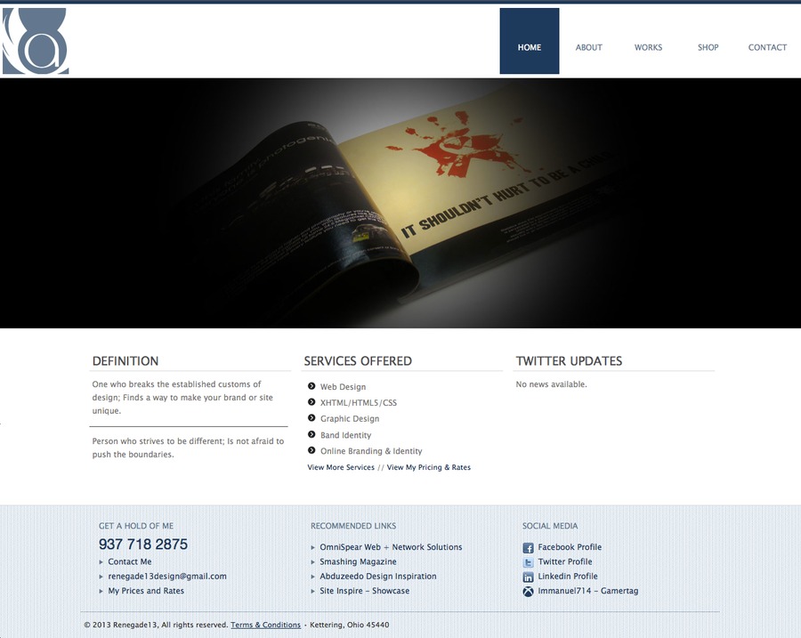 Renegade13 breaks the established customs of design and finds a way to make your brand or site unique. I previously worked for OmniSpear Web and Network Solutions, and I worked with clients such as Cox Media Group, Dayton Ronald McDonald House of Charities, McAfee Air Repair, and many other local companies.
