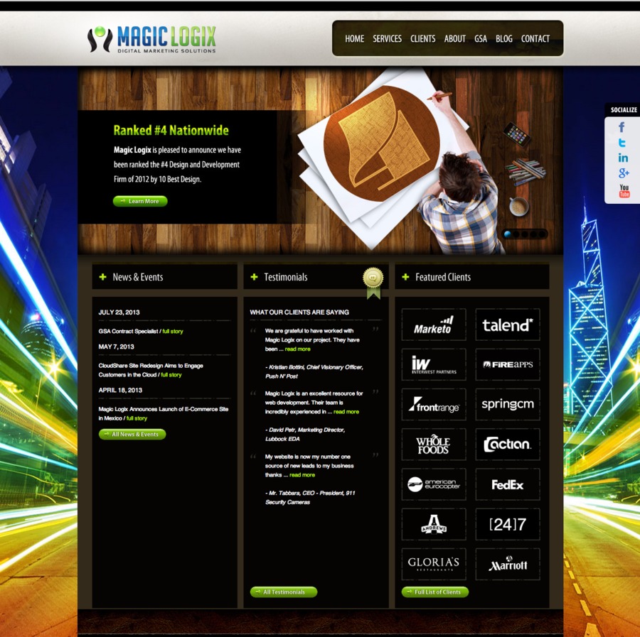 Magic Logix is a leading global digital marketing agency that drives client business growth by merging creativity, technology and online marketing. Through proprietary client intake, workflow and project management processes, Magic Logix consistently yields top quality results, client satisfaction and long-term relationships. Through continual discovery of new industry best practices and partnerships with industry leaders, Magic Logix delivers world class business expansion solutions to mid-sized to Fortune 500 companies and government agencies. Magic Logix continually ranks internationally in the top ten Web Design, SEO and Web Development firms by Top SEOs, Best Web Design Agencies, Interactive Media, Communicator Awards, Tech 200, is GSA certified and a fast growth company in Inc. 500. Our in-house staff works closely with clients to provide completely customized solutions using the latest technologies, best practices and originally developed approaches to produce top-quality ecommerce solutions, marketing automation tools, custom content management system (CMS) and customer relations management (CRM) integration, and dynamic Web presentations.