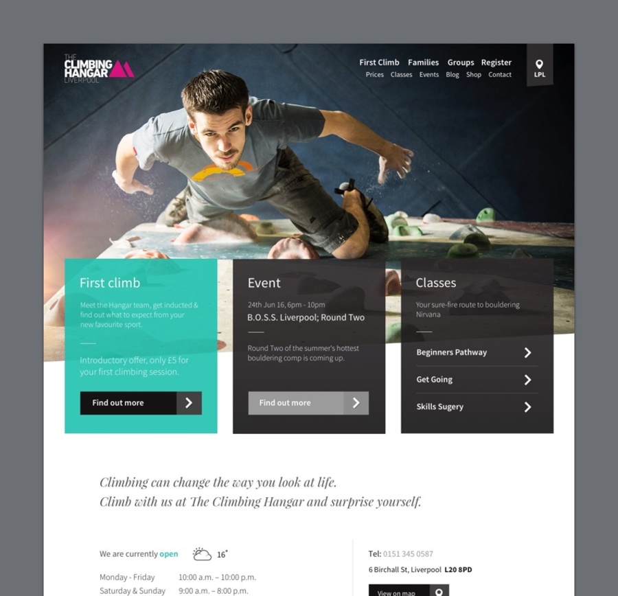 Bespoke responsive website for The Climbing Hangar. Climbing gym with sites across the UK.