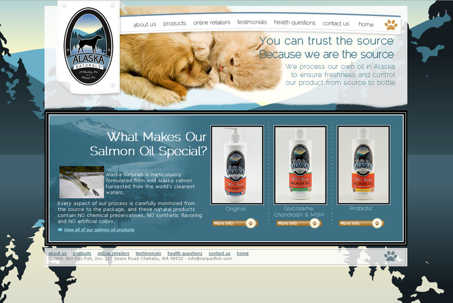 A screen shot of our recent web development project for Alaska Naturals pet products.