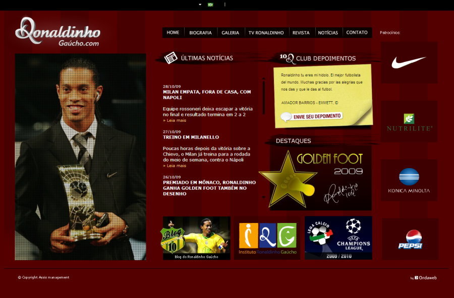 This is a screenshot from one of our most rewarding designs: Ronaldinho Gaúcho's website.