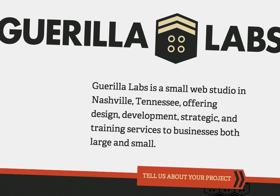 Guerilla Labs is a small web studio in Nashville, Tennessee, offering design, development, strategic, and training services to businesses both large and small.