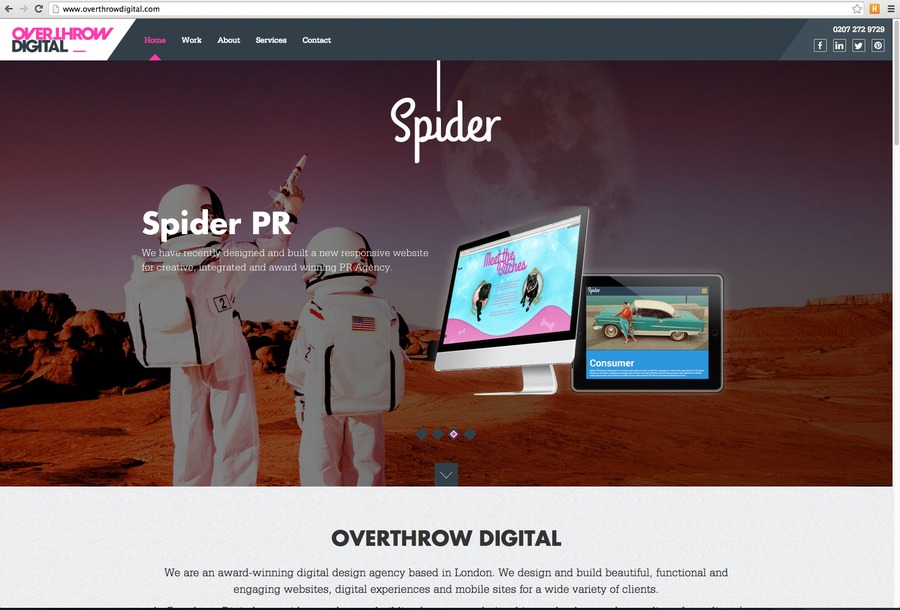 Creative, integrated and award winning PR Agency, Spider PR, asked us to help them update their existing brand and website to bring it in line with their forward thinking approach. The site needed to be visual, fully responsive and convey a sense of humour whilst maintaining a high end professional look.