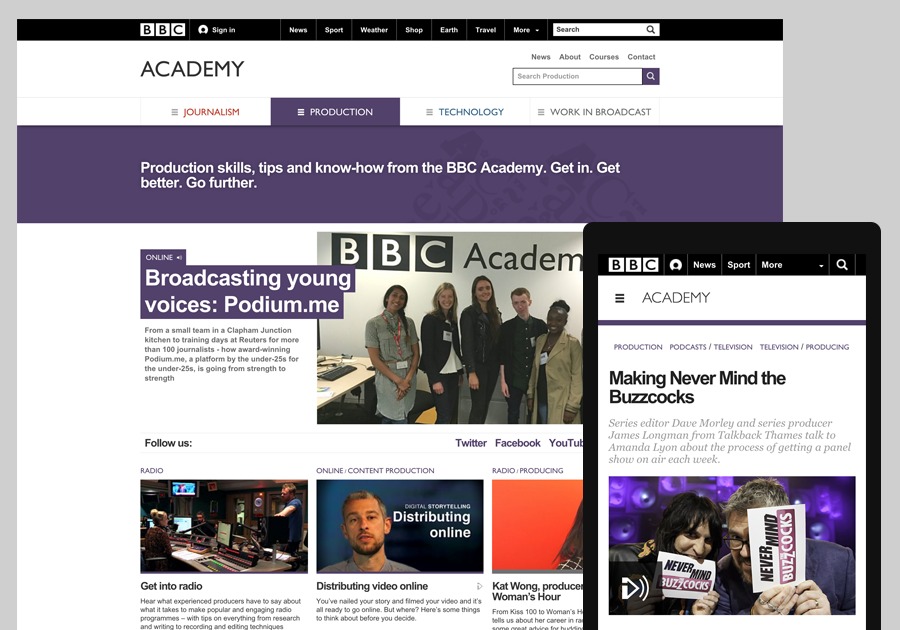 The Academy website was one of the BBC’s first fully responsive releases. The project was commissioned to bring the Colleges of Journalism, Technology, and Production together into one site.