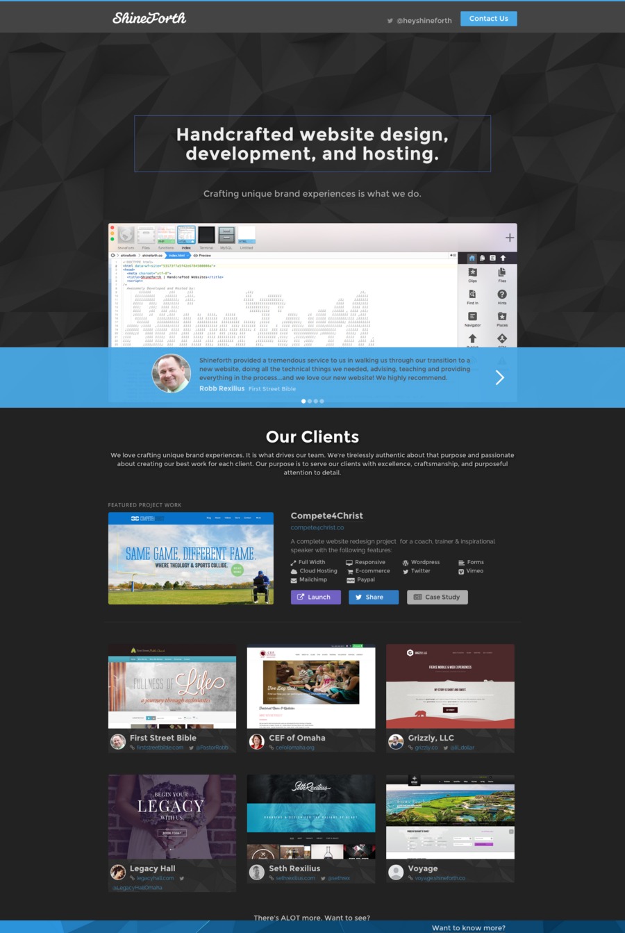 Crafting unique brand experiences is what we do. At ShineForth, we focus on handcrafted website design, development, and hosting. We love crafting unique brand experiences. It is what drives our team. We're tirelessly authentic about that purpose and passionate about creating our best work for each client. Our purpose is to serve our clients with excellence, craftsmanship, and purposeful attention to detail.