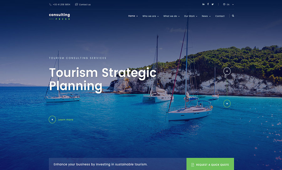 ConsultingPress is premium, SEO optimised consulting website template focused on four specific niches - tourism consulting, finance consulting, management consulting and IT security consulting.