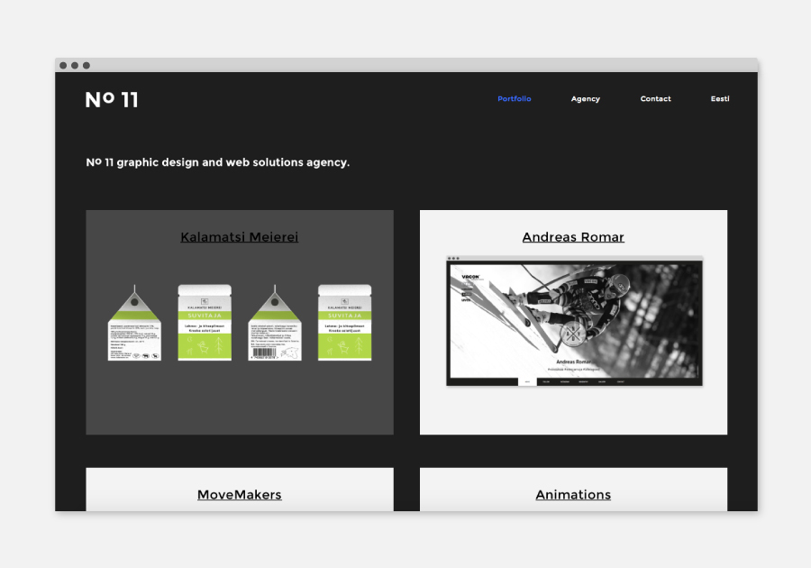 We are creative and efficient, small and ambitious, young and motivated. No11 agency is located in Tartu, we are specialized in visual identity and web solutions for small and big clients.