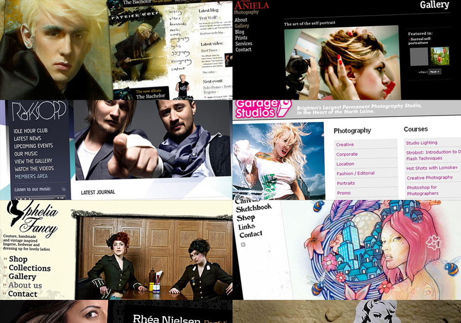 A collection of screenshots from my portfolio including websites for Royksopp, Patrick Wolf, Miss Aniela and Ophelia Fancy.