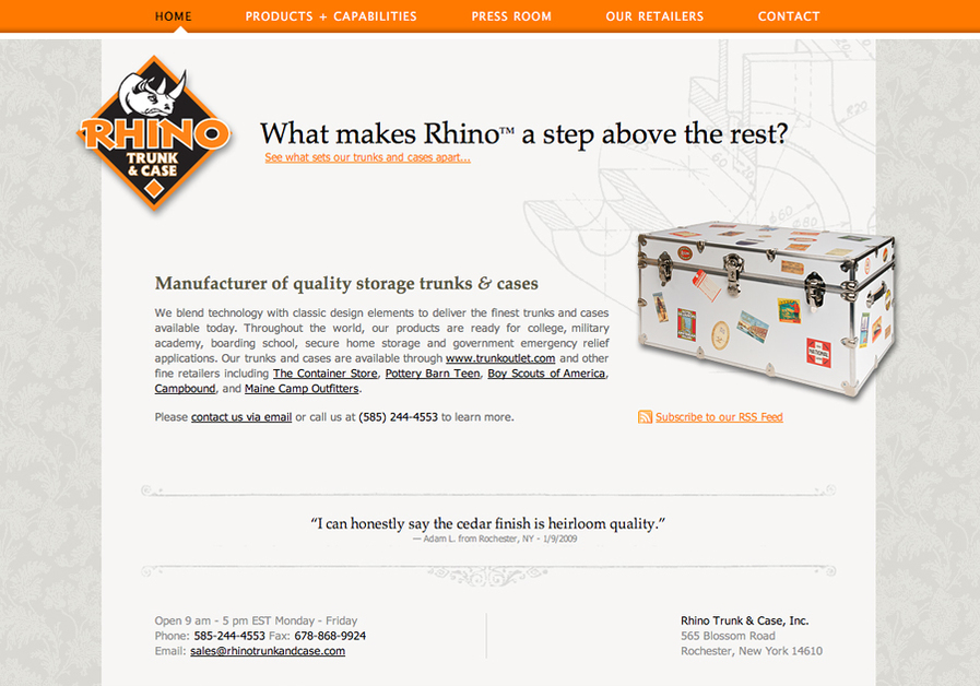 Homepage for Rhino Trunk & Case, a Rochester NY client.