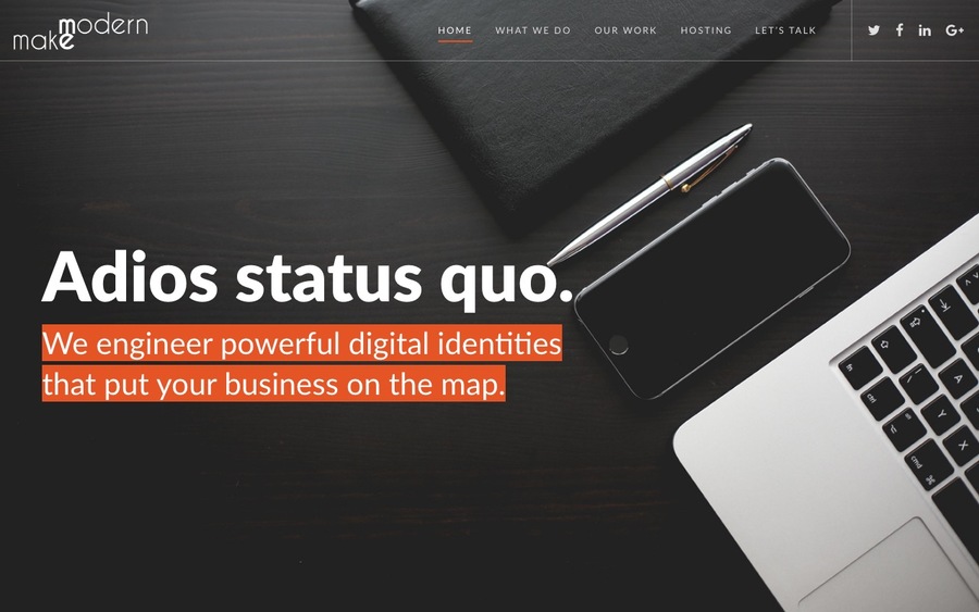This is a screenshot of our current home page. As the headline suggests, say goodbye to the status quo. It's time to let Make Me Modern build you a powerful digital identity and put your business on the map.