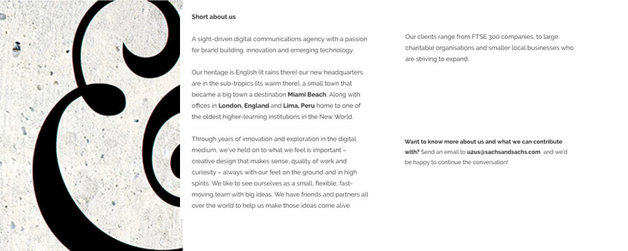 Want to know more about us and what we can contribute with? Send an email to u2us@sachsandsachs.com and we’d be happy to continue the conversation!