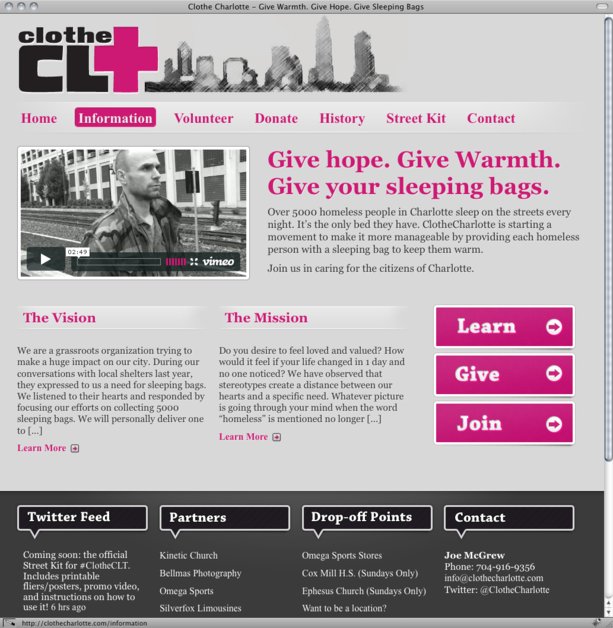 ClotheCharlotte.com - A site for a homeless ministry in Charlotte, NC. User-friendly, clean, and functional, with contact forms, downloads, and a touch of jQuery.