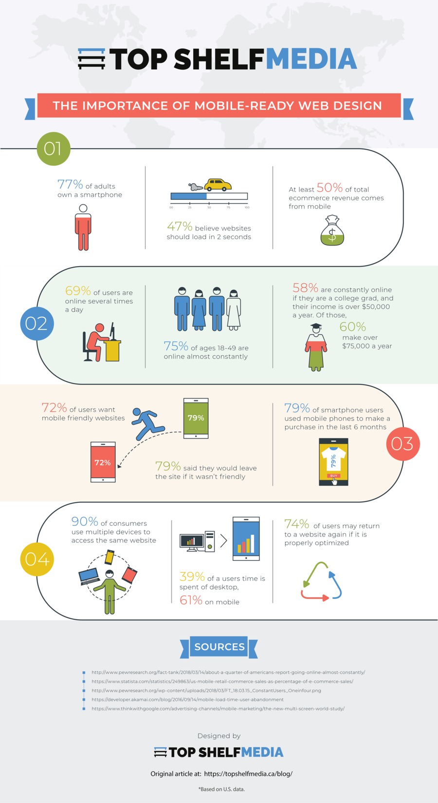 This is a infographic created to highlight the importance of having a mobile-responsive site in 2019. It details statistics taken from the United States, and quickly guides the viewer through the different internet usage trends and how they relate to mobile viewership.