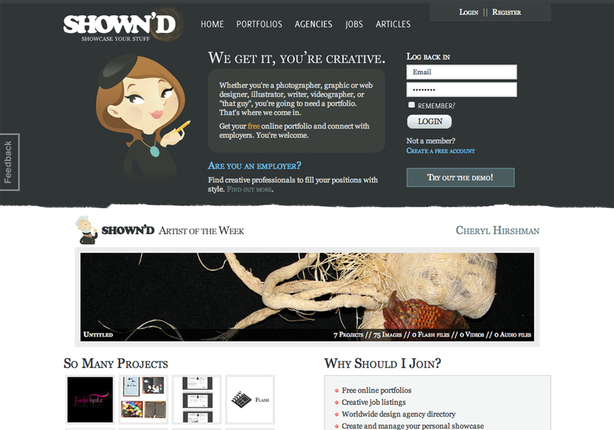 Front page of an artist portfolio hosting web application tailored to photographers, graphic designers, videographers, and composers.