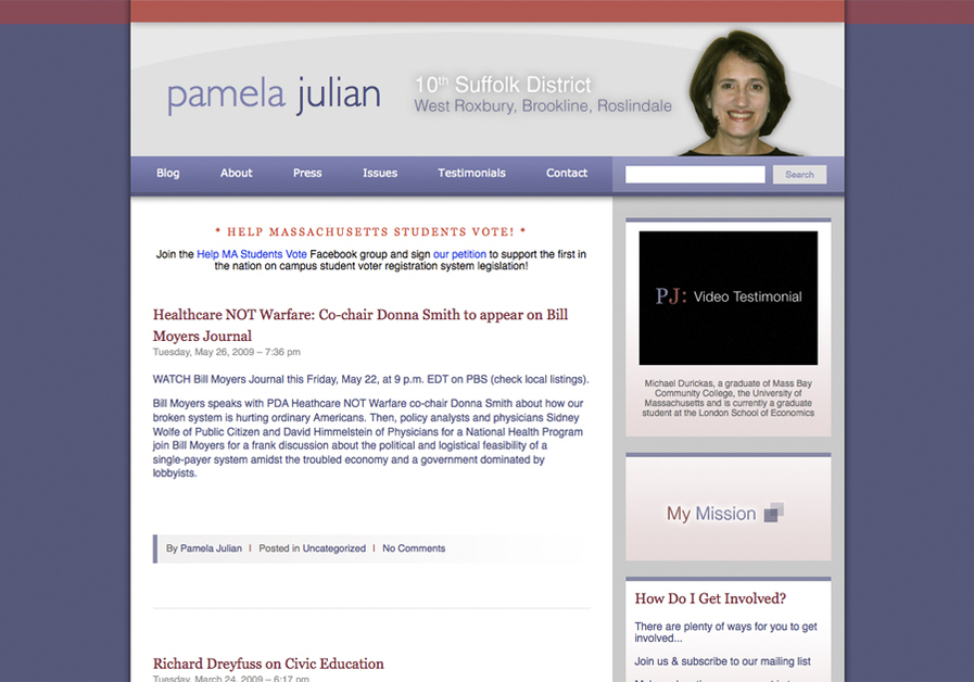 This is a screenshot of a recent WordPress blog site that I created for a local representative in MA.
