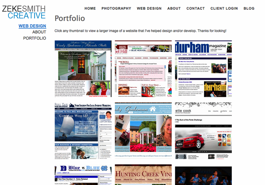 A screenshot from the web design portfolio section of my site, Zeke Smith Creative, where I offer web design/development and photography services.