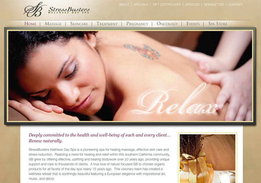 Atomic Blue designed a fantastic new website for StressBusters spa in Orange County to capture the atmosphere and experience of their spa. A custom built template for Wordpress was designed for easy client management.