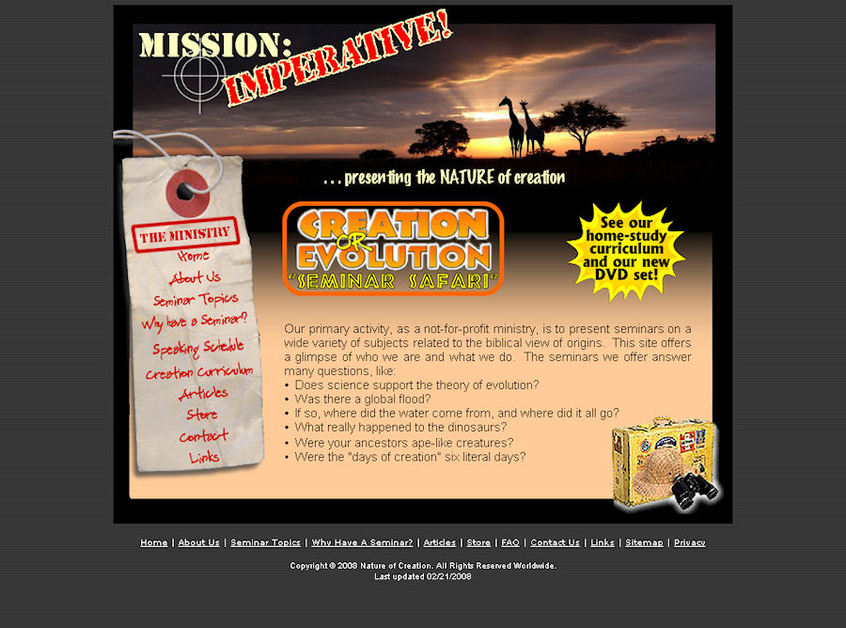 NatureofCreation.org is a website who's primary ministry is to present seminars on a wide variety of subjects related to the biblical view of origins. It includes a PayPal shopping cart.