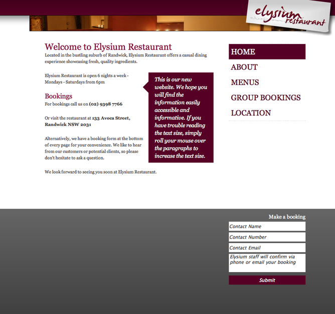 Elysium Restaurant website just had a site refresh. Check out the interactivity.