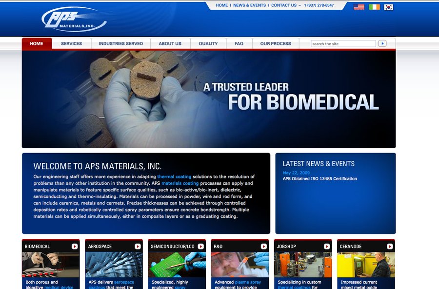 This is a screenshot of APS Materials, the leader in thermal spray technology.