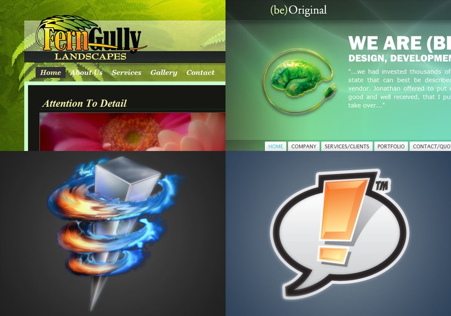 Four portfolio samples showing the range of our work. From the lush jungles of a landscaper's website to the bright and heroic logo design of a super web app.