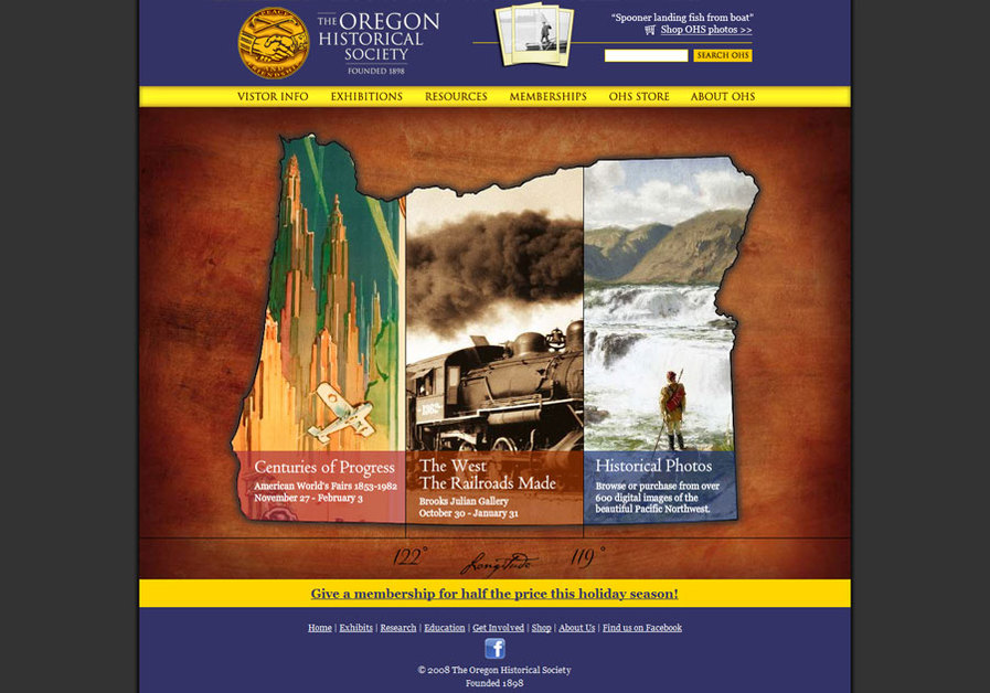 Home page screenshot of www.ohs.org - The Oregon Historical Society. The central feature is a sliding flash animation shaped like the state of Oregon.