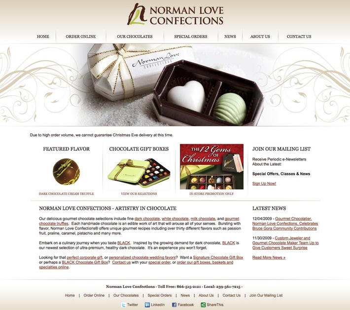Recently debuted, internationally known, gourmet chocolatier Norman Love's new web site -- featuring an online store, integrated New Media elements, and completely integrated with Google Analytics allowing for constant testing & measuring.