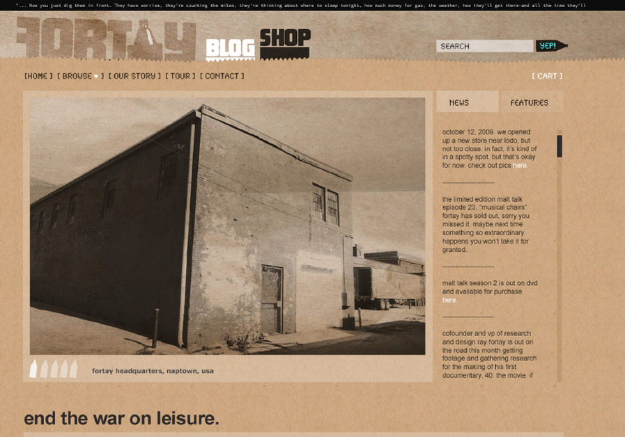 Screenshot of the Fortay website, a company specializing in 40oz enjoyment since 2008. The ecommerce site is built to sell and also entertain, with video, images, downloads and a blog. End the war on leisure. Drink a 40 today.