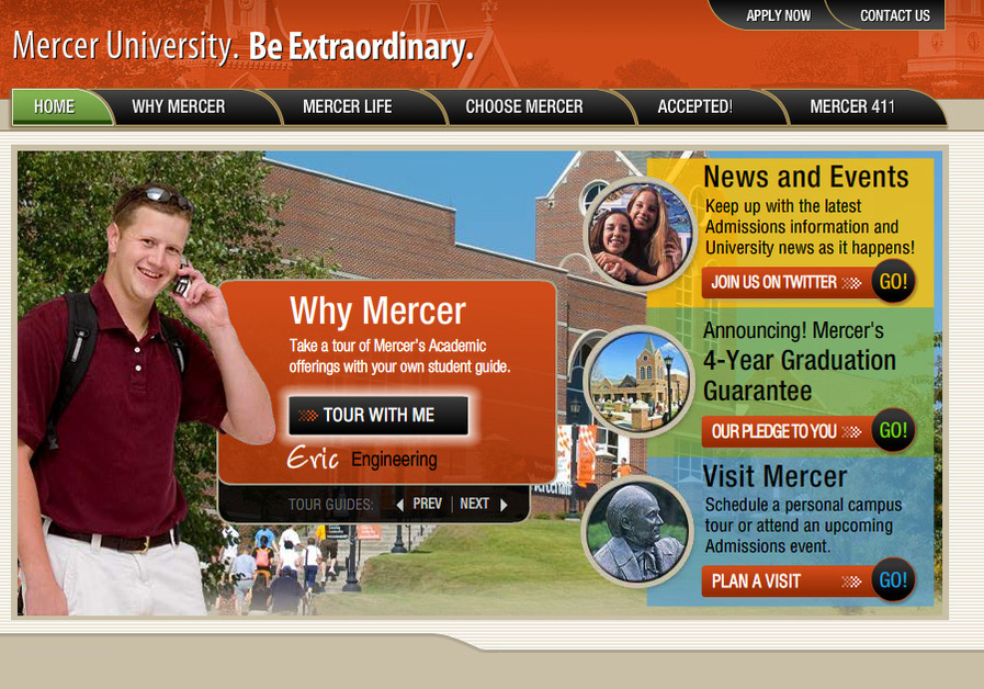 This admissions website is a cutting edge blend of Flash animated elements interspersed with streaming media clips all controlled by an intuitive, user friendly graphic interface. The admissions website for Mercer University represents a new trend in university and college recruitment efforts that require specialized online techniques to communicate to today's tech-savvy college-bound students. The website features over thirty minutes of custom streaming media clips produced completely by Third Wave Digital's team. In addition, GoMercer.com features an interactive campus map, over a dozen slide show presentations with hundreds of images of the university, custom music bedding, and highly innovative Flash animated elements.