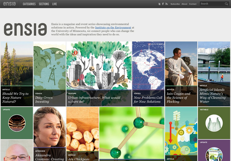 The responsive design of the Ensia website allows users to view the content with any device, while layouts are designed to reflect the content appropriately. Tiles of articles, stories, and updates are highly visual and highlight the content throughout the website.