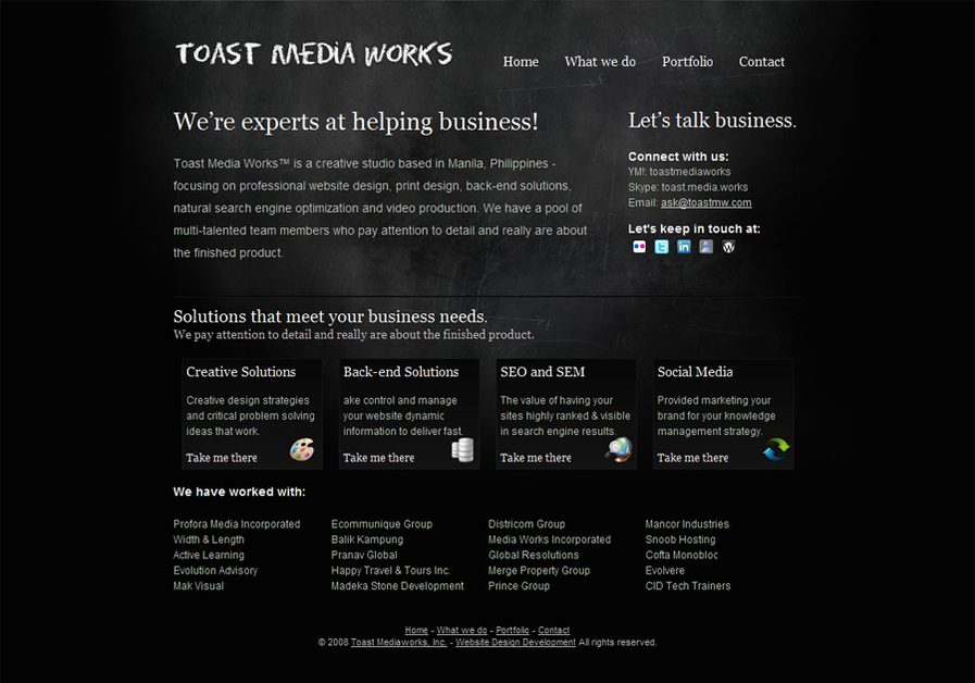 Toast Media Works™ is a creative studio based in Manila, Philippines focusing on professional website design, print design, back-end solutions, natural search engine optimization and video production. We have a pool of multi-talented team members who pay attention to detail and really are about the finished product.