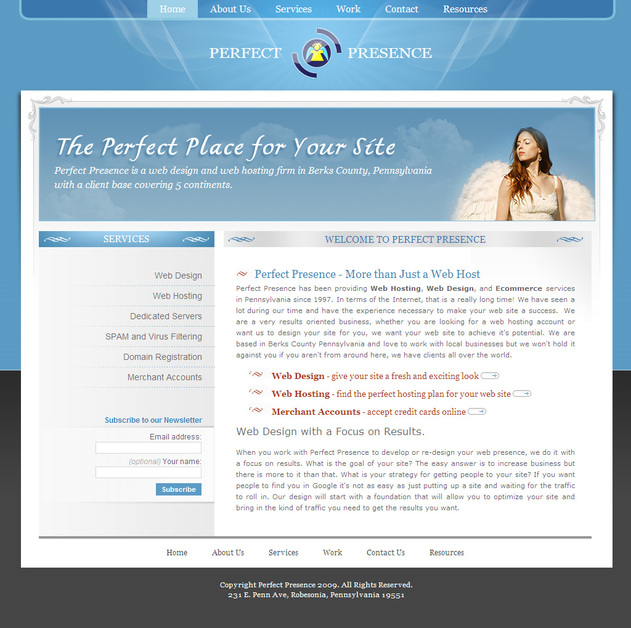 Perfect Presence is a Web Design, Hosting and Ecommerce company based Reading, Pennsylvania. We have been helping small businesses build a successful and profitable online presence since 1997. We believe in offering real value for the time and money our clients spend with us. We want your site to succeed so that you tell your friends about us and come back to us when you need more work done. We want to help you build your perfect presence.