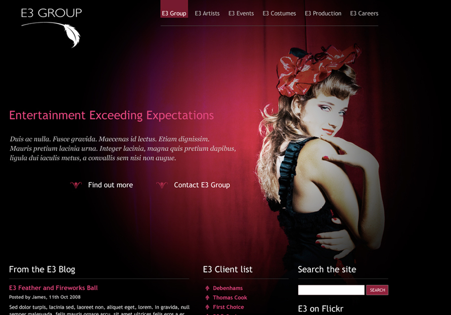 This is the homepage for the redesign of E3 group, a worldwide entertainment company.