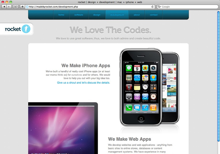 We design + develop for the Mac, iPhone and web. We make our own software and design + develop branding, web sites and applications for others too. Give us a shout if you're in the market for something killer.