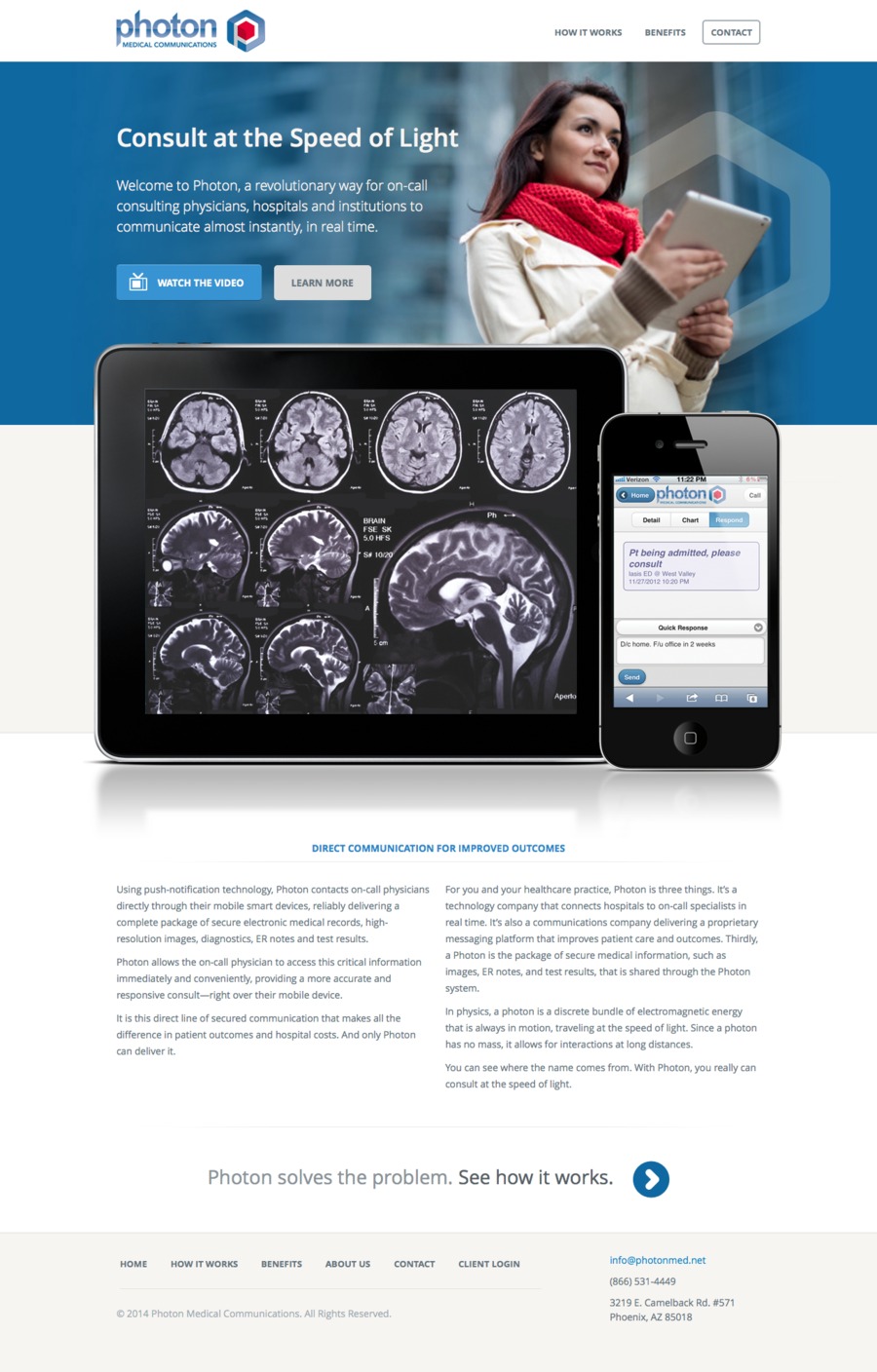 Photon Medical develops mobile apps that help health care facilities securely communicate in real-time with physicians. The site I designed and built for them, illustrates the high tech nature of their products, as well as the benefits they provide to health care facilities, physicians, and ultimately patients.